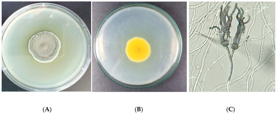 Obverse (A) and reverse (B) photograph of isolated Penicillium citrinum colony on PDA medium at 7 day. The morphology of fungal conidiophores cells was observed under a compound microscope (×40 magnification) view (C).