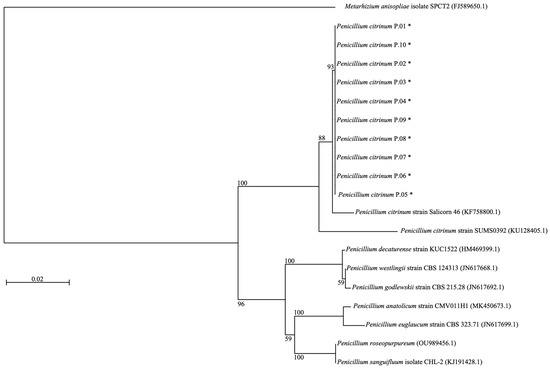 Ten strains of Penicillium isolates (namely P.01~P.10) were isolated from the infected insects (Table S2, Supplementary Material). These isolates grew well on PDA, with diameters of colonies ranging 3.5~4.3 cm within 10 days of incubation at 37 °C. The Penicillium colonies on the PDA medium formed a basal felt with floccose aerial mycelium giving rise to conidiophores. Colonies were short, floccose, flat, round, and olive green at the top and white at the periphery (Figure 1A,B). Conidiophores are born singly, and the wall was smooth and thin, typically bearing irregular penicillus that contained conidia and phialide. Conidia are produced in distorted chains, spherical to subspherical (Figure 1C). The morphology of isolates was similar to the characterization and identification of P. citrinum reported by Kumar et al. [26] and Mukherjee et al. [27]. Studies have reported the analysis of rRNA gene sequences for the polyphylogeny of the genus Penicillium [28], and the ITS region was useful for the identification and classification of Penicillium. In this study, the ITS1 region was amplified and sequenced to identify the isolated strains. Sequence analysis of P.01~P.10 clones demonstrated 100% similarity to the sequence of P. citrinum isolate C2C in the GenBank database (accession no. MH990629.1). The nucleotide sequence of these isolates was deposited in the GenBank, and the accession number is shown in Table S2 (Supplementary Material). A phylogenetic tree was constructed using the ITS1 sequences of the isolates (ca 840 nucleotides) and the Penicillium genus (Figure 2). Phylogeny consisted of 20 trains and indicated that the isolated strains were attached with P. citrinum strain SUMS0392 (KU128405.1) with 100% bootstrap support (Figure 2). These results confirmed that the P.01~P.10 isolates were the species P. citrinum.