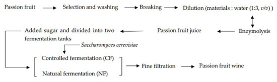 At 0–6 days, samples were taken once a day. At 6–20 days, samples were taken once every 2 days. The process flow of passion fruit wine is shown in Figure 1.