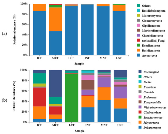 At the phylum level, 8 phyla in the NF and 11 phyla in the CF were identified (Figure 2a). Ascomycota and Basidiomycota were the main phyla, and Ascomycota was the most dominant phylum in the fermentation process of passion fruit wine. Some studies have shown that Ascomycota is not only the dominant fungus in the fermentation process of fruit wine, but also the main fungal community in a variety of fermented foods, such as rice wine and vinegar [24]. In summary, Ascomycota and Basidiomycota are the main fungal communities in a variety of fermented foods [25]. The abundance of Ascomycota in the ICF and MCF treatments was lower than that in the INF and MNF treatments, respectively, and the abundance of Basidiomycota in the ICF and MCF treatments was higher than that in the INF and MNF treatments, respectively. Thus, different fermentation methods significantly affected the structure of fungal communities. In addition, it has been confirmed that inoculating yeast could shorten fermentation time and impart a complex flavor to fruit wine. Liu et al. [26] reported that in the fermentation of green plum wine, there is a good interaction between Saccharomyces cerevisiae and Torulaspora delbrueckii, which enhances the floral and fruity flavor of the wine.