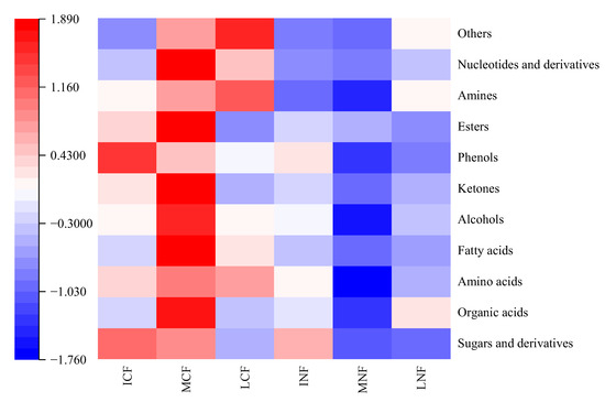 Heatmap of different types of nonvolatile metabolites during fermentation.
