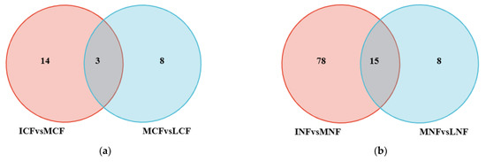 Venn diagram of differential volatile flavor substances during fermentation. (a) CF group; (b) NF group.