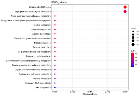 The above 18 differential metabolites were annotated to 19 metabolic pathways with significant differences, among which the citrate cycle (TCA cycle) and glyoxylate and dicarboxylate metabolism were the main metabolic pathways, and the citrate cycle (TCA cycle) metabolic pathway was enriched significantly (Figure 6).