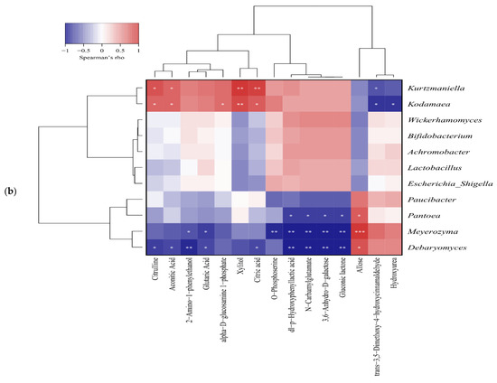 Heatmap of the correlation between the microbial community and the nonvolatile differential. The microorganisms selected in the CF and NF were fungal genera and bacterial genera, with relative abundances > 5%; “*” p < 0.05, “**” p < 0.01, “***” p < 0.001. (a) CF group; (b) NF group.