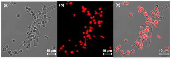 For Candida wangnamkhiaoensis cultivated in glucose, an optical micrograph (900×) (a), a confocal laser scanning microscope image (showing the fluorescence of the lipids) (b), and the overlap of the two images (c).