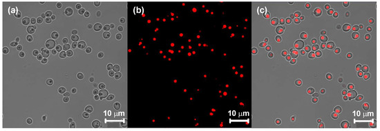 For Candida wangnamkhiaoensis cultivated in glycerol, an optical micrograph (900×) (a), a confocal laser scanning microscope image (showing the fluorescence of the lipids) (b), and the overlap of the two images (c).