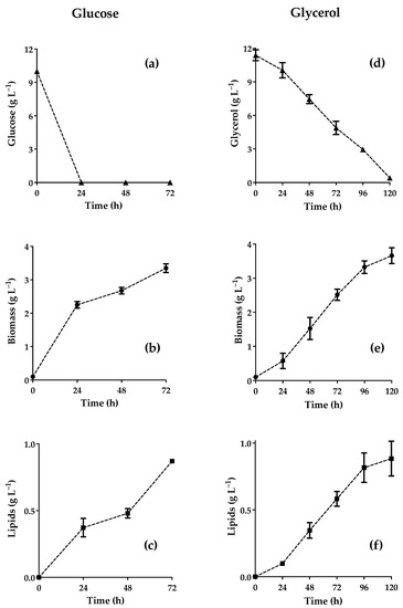 The kinetics of cell growth, substrate consumption, and lipid production by CW are illustrated in Figure 3 for each of the two substrates, glucose (Figure 3a–c) and glycerol (Figure 3d–f).