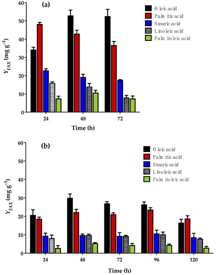 Based on the concentrations of fatty acids obtained, a calculation was made of the yields of the different fatty acids in relation to biomass (YFAX) (Figure 4), finding higher values with glucose (Figure 4a) versus glycerol (Figure 4b) as the substrate. At 48 h of incubation, for example, the production of oleic acid by CW was 76.35% greater with glucose (YFAX = 52.94 mg g−1) than glycerol (YFAX = 30.02 mg g−1).