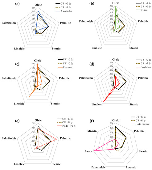 Regarding the composition of fatty acids (% w/w), comparisons were made between CW cultivated with glucose (CW-Glu) for 72 h or glycerol (CW-Gly) for 48 h and different vegetable oils extracted from avocado fruit (a), olives (b), peanuts (c), soybeans (d), palm fruit (e), and palm kernels (f).