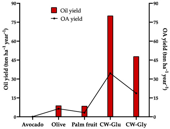 Given the importance of oleic acid in diverse industries, its yield was graphed (Figure 6) for the different crops and the present yeast cultures. The proportion of oleic acid in each type of oil was taken into account, constituting 51% of the total weight of avocado oil [63], 71% of olive oil [64], and 38% of palm oil [64]. The percentage of oleic acid in the composition of the oil derived from CW cultivated in glucose or glycerol was based on this study (43% and 39%, respectively). As can be appreciated (Figure 6), the potential yields per hectare are far superior for oil and oleic acid obtained from CW versus avocados, olives, and palm fruit.