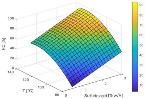 As the model shows, in the upper limits of the space studied, the predicted and observed values correspond to 80–90 of %HC. Considering that the goal of the treatment with diluted acids is the solubilization of hemicellulose, the results were close to maximum effectiveness conditions. Sulfuric acid concentration and Temperature were the most important factors that had a significant impact on solubilization of the hemicellulose. The interaction between the temperature and the sulfuric acid concentration was particularly interesting (Figure 2). These findings may be mainly due to the range of conditions tested. A wider range of conditions (100–170 °C and 1.4–3.2% w/w H2SO4) lead to obtaining response surface models for the release of xylose and arabinose, in which, a significant interaction between temperature and sulfuric acid concentration can be observed []. In the range of conditions evaluated in this work, the surfaces resemble planes, presenting curvatures in higher values, and being influenced primarily by the temperature.