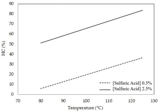 Figure 3 summarizes the effects of the factors studied: bars correspond to the average values of %HC reached at the corner points of the factorial design. It can be seen that at low and high temperature values, 80 °C and 125 °C, respectively, the %HC increased significantly as the acid concentration increased and the reaction time was maintained constant. On the other hand, non-significant changes can be observed by increasing reaction time and leaving the other variables fixed. This suggests that a significant fraction of the hemicellulose was solubilized relatively quickly and/or during the transient state (heating stage). Similar observations were reported for the hydrolysis of Pinus taeda with dilute sulfuric acid at pH = 1.65 and 150 °C; a significant amount of hemicellulose was also solubilized during the heating of the reactor [].