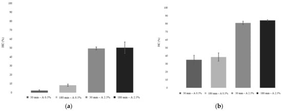 Bar graph for %HC at T = 80 °C (a) and T = 125 °C (b). No significant differences were observed when reaction time increased from 30 min to 180 min.