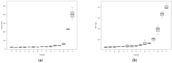 Boxplot that shows the furfural (a) and HMF (b) production by treatment. The treatment sequence is running from low to high concentrations.