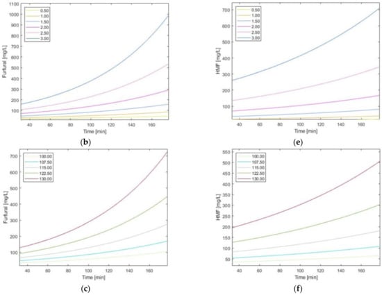 The surfaces obtained with both models are shown in Figure 5 for a reaction time of 180 min, in which, the exponential effect on the responses occurs towards at the upper values of temperature and acid concentration. The temporal evolution of furfural and HMF concentrations at constant temperature or acid sulfuric concentration, with the other operative conditions free in the studied range are also shown.