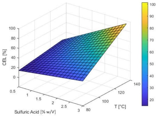 The glucose concentration in the liquid phase was monitored in all reactors by sampling every 2 h, for a duration of 72 h. In order to analyze the effects of pretreatment on cellulose conversion, glucose concentration was analyzed 12 h after the starting of the enzymatic saccharification. A mathematical relationship with high goodness of fit (R2 = 0.98) for %CEL (Equation (7)), as a function of temperature, sulfuric acid concentration and time was encountered. The surface response for different temperatures and acid concentrations is shown in Figure 6.