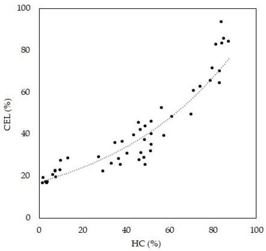 Dispersion graph showing relation between %HC and %CEL at 12 h of enzymatic saccharification.