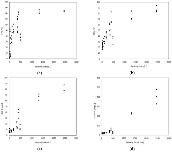 Dispersion graphs showing relations between Severity Factor R0′ and %HC (a), %CEL (b), HMF (c) and Furfural (d), respectively.