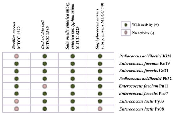 The ability of any bacterial strain to survive in gastrointestinal transit, highly acidic and strong bile [,] and the adhesion property to epithelial cells [,] are the most important preliminary screening criteria to claim the tentative probiotic properties. Hence, we evaluated 352 bacterial isolates from the Himalayan fermented soybean foods based on their survival in low pH, bile salt, and adhesion property in terms of hydrophobicity index. Finally, eight strains of lactic acid bacteria were selected as probiotic bacteria viz. Pediococcus acidilactici strains Ki20 & Ph32, Enterococcus faecium strains Kn19 & Pn11, E. faecalis Gc21 & Pn37 and E. lactis Py03 & Py08. Species of Enterococcus and Pediococcus, isolated from other fermented soybean foods, also manifested the ability to resist low acid and bile salt, indicating their easy colonization of the human gut [,]. Detection of genes groEl, clpL, and apf in identified strains of Enterococcus and Pediococcus justify their responsibility for acid and bile tolerance []. Gene (bsh) responsible for bile salt hydrolase (BSH) usually correlated with the ability to lower serum cholesterol levels [] was also detected in all strains of Pediococcus and Enterococcus. The microbial adhesion of LAB to hydrocarbons with a hydrophobicity index of ≥70% is being classified as highly hydrophobic strains []. Moreover, the results in the current study showed the hydrophobicity of ≥80% in all strains of P. acidilactici, E. faecium, E. faecalis, and E. lactis, which indicates their strong adhesion capabilities to the epithelial cells []. All strains showed the presence of msa gene, whereas only four strains of Enterococcus showed the presence of mucus adhesion mub1 gene, which is responsible for cell surface adherence/attachment []. In addition to adhesion, auto-aggregation and co-aggregation properties of probiotic bacteria that prevent pathogens from surface colonization were also recorded. Auto-aggregation could enable self-joining association of the same species of LAB attached to the mucosal surface []. Co-aggregation enables the intercellular attachment/adhesion with other microorganisms bound up with the ability to interact with pathogens []. Therefore, the ability of LAB strains for auto-aggregation and co-aggregation is related to the adhesion capacity that has an effect on reducing mucosa colonisation by pathogenic strains []. The ability to colonize is an important characteristic for probiotic isolates to exhibit beneficial properties and exclude pathogenic bacteria []. In the present study, we also observed the resistivity to lysozyme by the species of Pediococcus and Enterococcus. Tolerance to lysozyme is the first valuable step to evaluate the potential contribution of LAB in extreme environments of gastrointestinal pathways []. In addition, the results recorded indicate the ability of LAB strains to inhibit the growth of pathogens, which is one of the most desirable properties of probiotic strains to exhibit antibacterial activity []. The antibacterial activity of LAB against pathogens and spoilage microbes could be due to the production of bacteriocin or bacteriocin-like inhibitory substances (BLIS) [,]. The PCR-based method also revealed the detection of pediocin genes pedA and pedB, a class of bacteriocin [] detected in Pediococcus acidilactici. Pediocin produced by Pediococcus acidilactici might be able to create pores in the cell membrane that ultimately leads to cell death []. Similarly, the detection of enterocin (entA, entB), which are structural genes for enterocin Xα and Xβ, respectively [], in Enterococcus species, indicated their antimicrobial spectrum. The detection of enterocin-producing genes in Enterococcus species might attribute to controlling the target bacteria by inducing membrane porosity that causes leakage of target cells or by interfering with the DNA replication and transcription [].