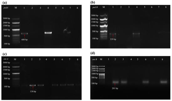 Marker genes associated with probiotic characteristics detected by PCR amplification. Detection of the gene associated with pediocin (a) pedA and (b) pedB. Marker genes were associated with enterocin (c) entA and (d) entB. Gel electrophoresis image description: ‘M’ DNA ladder (100 bp); (1) Pediococcus acidilactici Ki20 (Kinema); (2) Enterococcus faecium Kn19 (Kinema); (3) Enterococcus faecalis Gc21 (Grep-chhurpi); (4) Pediococcus acidilactici Ph32 (Peha); (5) Enterococcus faecium Pn11 (Peron namsing); (6) Enterococcus faecalis Pn37 (Peron namsing); (7) Enterococcus lactis Py03 (Peruñyaan); (8) Enterococcus lactis Py08 (Peruñyaan).