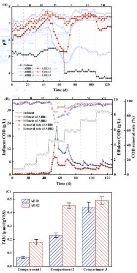 The effluent COD of ABR1 and ABR2 was approximately 0.2 g/L from Stages I to III. When the OLR rose to 3.0 kg COD/(m3·d) in Stage IV, the effluent of the two systems deteriorated at different degrees. The effluent COD concentrations of ABR1 and ABR2 peaked at 6.38 g/L (60.19% removal) and 2.37 g/L (85.58% removal), respectively. From Stages V to VII, the effluent COD of ABR1 and ABR2 decreased and stabilized at 1.45 ± 0.25 and 0.93 ± 0.17 g/L, respectively. The stable effluent COD levels were due to the succession of microbial populations when the organic loading increased from Stages IV to V, which enhanced the tolerance of the system to high organic loading []. The largest difference between the COD removal rates of the two ABRs existed in ABR1-1 and ABR2-1. From Stages IV to VII, ABR2-1 removed over half of the influent COD in ABR2, while ABR1-1 removed only 23.15% ± 12.31% (Table 2). The low COD removal rate of ABR1-1 might be associated with its low pH value (5.3 ± 0.4). Anaerobes are sensitive to pH fluctuations, and abrupt changes in pH would inhibit the microbial activity of methanogens []. Low pH would inhibit microbial activity and reduce the hydrolysis and methanogenic capacity, hindering the anaerobic degradation of VFA []. Even worse, VFA accumulation would further decrease the pH of the system []. Fortunately, the obligate anaerobic system alleviated pH fluctuation by maintaining excellent buffering performance and system stability.
