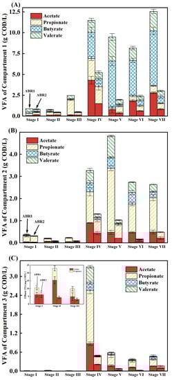 As basic operating parameters, pH and anaerobic degree control the distribution and activity of functional microbes, resulting in various profiles of VFAs in different compartments. The VFA composition and concentration in ABR1-1 and ABR2-1 differed significantly (Figure 2A). ABR1-1 was dominated by butyrate and valerate, while ABR2-1 was dominated by acetate and propionate. This might be related to the different pH of the two compartments, which would cause different types of primary fermentation []. From Stages IV to VII, the VFA concentration in ABR1-1 was 2.2 to 4.8 times higher than that in ABR2-1. When the influent OLR was 3.0 kg COD/(m3·d), the VFA of ABR1-1 exceeded 11.00 g COD/L, deteriorating the effluent quality and destabilizing the system. The predominant VFA in ABR1-2 and ABR2-2 was propionate (Figure 2B). In ABR1-2, VFA peaked at 4.82 g COD/L with 2.89 g COD/L of propionate. The peak VFA concentration in ABR2-2 was 1.30 g COD/L with 0.61 g COD/L of propionate, a 78.8% decrease in propionate compared with that of ABR1-2. The propionate concentration in ABR2-2 was always lower than that in ABR2-1, while in ABR1, the propionate concentration increased from 0.54 ± 0.26 g COD/L in ABR1-1 to 1.91 ± 0.71 g COD/L in ABR1-2 from Stages IV to VII. The increase in propionate concentration indicates that the main biochemical reaction in ABR1-2 was the conversion of long-chain fatty acids to propionate and acetate via β-oxidation rather than the degradation of propionate []. The significant difference in the VFA concentration of ABR1-2 and ABR2-2 demonstrates that VFA degradation was much stronger in ABR2-2 than in ABR1-2.