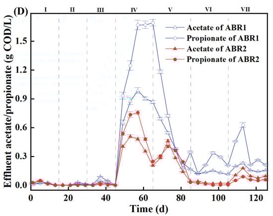 The VFA accumulation in ABR1-3 and ABR2-3 represents the effluent quality and treatment efficiency. From Stages I to III, the effluent of ABR1 comprised mainly acetate and propionate with a total concentration of 0.02 to 0.03 g COD/L, whereas the effluent of ABR2 contained only acetate with a concentration of approximately 0.01 g COD/L. When the OLR increased to 3.0 kg COD/(m3·d) in Stage IV, VFA accumulated in ABR1, with the total concentration increased from 3.27 g COD/L in ABR1-2 to 3.30 g COD/L in ABR1-3. The peak concentrations of acetate and propionate in ABR1-2 and ABR 1-3 reached 0.99 and 1.69 g COD/L, respectively (Figure 2D). By contrast, the VFA in ABR2 decreased from 1.30 g COD/L in ABR2-2 to 0.49 g COD/L in ABR2-3 at the same time. This is exactly why the effluent COD concentrations between ABR1 and ABR2 were significantly different. ABR1-3, which was the main methanogenic phase like ABR2-3, showed no significant degradation of VFAs, indicating the absence of propionate-oxidizing bacteria and acetoclastic methanogens []. Stimulated by the high substrate concentration in Stage IV, the corresponding functional microorganisms grew rapidly []. The increase in the relative abundance of functional microbes enhanced the resistance to high OLR of anaerobic activated sludge []. Therefore, after the restoration of stability, the buffering capacity and load resistance of ABR1 were enhanced and the VFA degradation rate increased. From Stages V to VII, although the gap between the two systems narrowed, the effluent VFA of ABR1 (0.48 ± 0.09 g COD/L) was higher than that of ABR2 (0.09 ± 0.05 g COD/L).