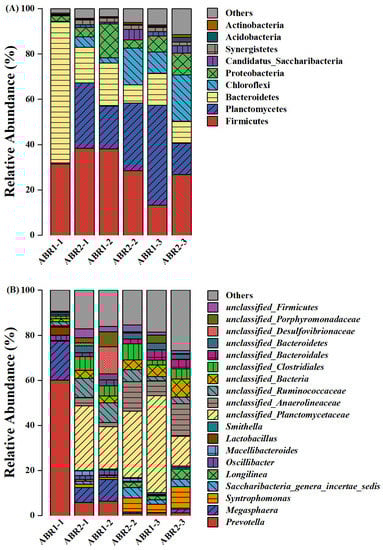 Bacterial communities of the two ABRs mainly contained nine phyla, among which Firmicutes (13.26% to 38.3%), Bacteroidetes (8.04% to 62.29%), Chloroflexi (0.19% to 20.52%), Proteobacteria (2.55% to 15.02%), Synergistetes (0.21% to 2.07%), and Actinobacteria (0.2% to 2.07%) were common fermentative groups in mesophilic anaerobic reactors (Figure 4A) []. Firmicutes and Bacteroidetes hydrolyze polysaccharides such as cellulose and starch []. The relative abundance of Synergistetes was 1.31% ± 0.78% in ABR1 and 1.85% ± 0.18% in ABR2. Synergistetes can participate in syntrophic methanogenesis processes []. Planctomycetes were uncommon in other anaerobic systems; however, the relative abundance of Planctomycetes was 13.75% to 44.06% in all compartments except for ABR1-1. In addition to Anammox and the obligate aerobes Planctomyces and Pirellula, Planctomycetes include some genera isolated from lakes and wetlands for fermentation []. Unclassified Planctomycetaceae, presumably fermenting bacteria, accounted for a significant proportion (26.71% ± 10.24%) in all compartments except for ABR1-1 (Figure 4B).