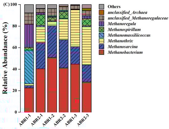 The dominant archaea at the gene level were Methanobacterium (22.5% to 50.8%), Methanosarcina (2.21% to 29.48%), Methanothrix (1.66% to 35.52%), Methanomassiliicoccus (0.09% to 31.12%), Methanospirillum (0.27% to 9.98%), and Methanoregula (0.36% to 21.26%) (Figure 4C). Methanobacterium was the dominant archaeal genus in all compartments (44.20% ± 3.70%) except for ABR1-1 (22.5%) and ABR2-3 (28.14%), consistent with previous studies where Methanobacterium dominated methanogenic biocathodes [,]. The dominant genus of ABR1-1 was Methanomassiliicoccus (31.12%), which emerged during the recovery process after an organic overload and increased in abundance at high OLR []. The relative abundance of Methanomassiliicoccus in other compartments of two ABRs was 0.72% ± 0.38%, significantly lower than that of ABR1-1. The dominant genus of ABR2-3 was Methanothrix (Methanosaeta) (35.52%), which uses acetate to produce methane []. Likewise, Methanosarcina performs methanogenesis mainly via acetylation in combination with other methanogenesis pathways []. The relative abundance of Methanothrix and Methanosarcina was 13.25% ± 12.92% and 15.99% ± 9.64%, respectively, in ABR1 and 24.53% ± 12.72% and 22.03% ± 3.96%, respectively, in ABR2. Methanogens that can produce methane via direct acetate cleavage include only two genera (Methanosarcina and Methanothrix) []. The relative abundances of Methanospirillum in ABR1 and ABR2 were 2.13% ± 1.15% and 7.62% ± 1.47%, respectively. Methanospirillum degrades propionate in syntrophic cocultures with S. propionica through the C6-dismutation pathway []. Therefore, these genera are the key organisms in high-rate anaerobic reactors, as acetate and propionate are the dominant intermediates in methane production []. The high abundance of acetoclastic methanogens in ABR2 enhanced the utilization of acetate, and the rapid degradation of acetate could effectively mitigate the poor degradation of propionate, butyrate, and valerate. Overall, the obligate anaerobic conditions of ABR2 facilitated the growth of syntrophic VFA-oxidizing bacteria and acetoclastic methanogens, alleviating VFA accumulation and maintaining the stability of the system.