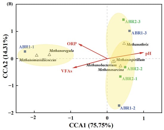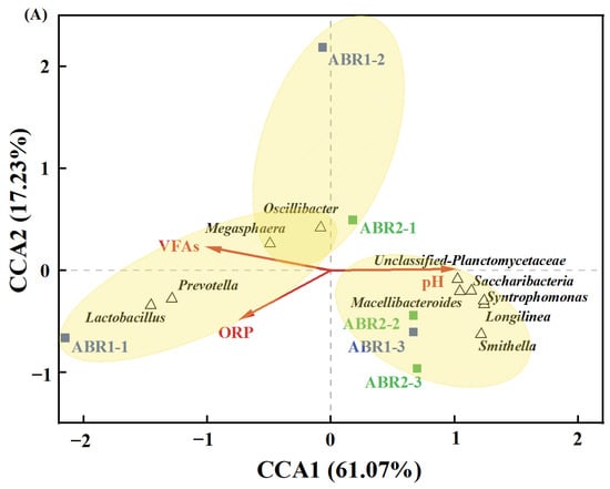 A canonical correlation analysis (CCA) map shows the relationship between environmental variables (ORP, VFA, and pH) and the dominant functional microbial genera in the ABRs (Figure 5). The correlation coefficients’ R’s between ORP, pH, and VFA and dominant functional microbial genera are 0.684, 0.964, and 0.986, respectively. The angle between ORP and VFA is acute, indicating a positive correlation []. Therefore, low ORP promotes the degradation of VFAs, supporting the conclusion that an obligate anaerobic system mitigates VFA accumulation. The angle between VFA and pH is obtuse (a negative correlation), indicating that VFA accumulation would decrease pH. Low pH hinders the metabolism of anaerobes and destabilizes the anaerobic process. The genera that favorite the degradation of VFAs, such as Syntrophomonas, Smithella, Methanothrix, and Methanosarcina, were more related to the samples from ABR2. Furthermore, these bacteria were in the opposite direction of ORP, indicating that low ORP promotes their proliferation. The samples from ABR2 are in the opposite direction of VFA for both bacteria and archaea, representing a negative correlation. Thus, VFA consumption was enhanced in ABR2. As a result, ORP, representing anaerobic degree in this study, significantly affects the composition of the functional microbial community and the system performance during anaerobic digestion.