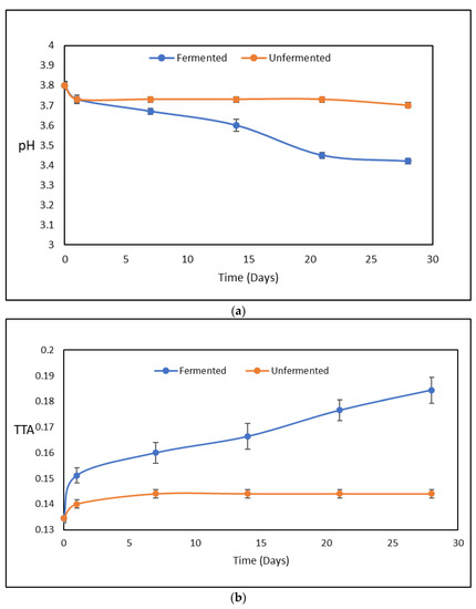 (a) pH values and (b) total titratable acidity (TTA) values of the fermented and unfermented juices during cold storage.