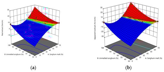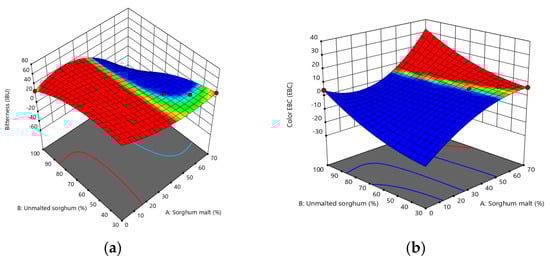 All data analyses were performed in triplicate and results were expressed as mean ± standard deviation. Physicochemical and sensory characteristics of experimental samples were assessed by one-way ANOVA and Tukey’s HSD at alpha = 0.05 was used to test for significant differences between mean data. Using the Design of Experiments software (DOE) (Design Expert, trial edition, Stat-Ease, Inc., Minneapolis, MN, USA), the data were plotted illustrating the fluctuation of beer parameters according to the varied levels of sorghum flour and sorghum malted flour. The mean value of the sensory data was graphically displayed by the assessors using Microsoft Excel. Principal component analysis (PCA) was performed in order to analyze the differences and correlations between beer samples and their physicochemical characteristics. For this purpose, XLSTAT 2021.2.1 software was used.
