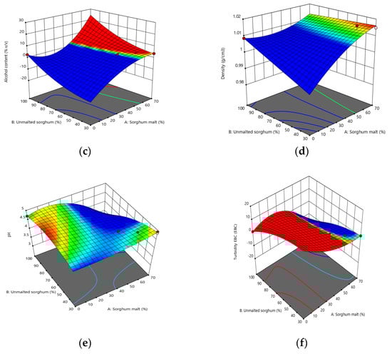 The graphical representations of the original extract (a), apparent extract (b), alcohol content (c), density (d), pH (e), and turbidity (f) as affected by the levels of unmalted sorghum and sorghum malt used in the beer recipe.