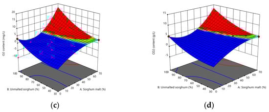 The graphical representations of the bitterness value (a), color (b), O2 content (c), and CO2 content (d) as affected by the levels of unmalted sorghum and sorghum malt used in the beer recipe.
