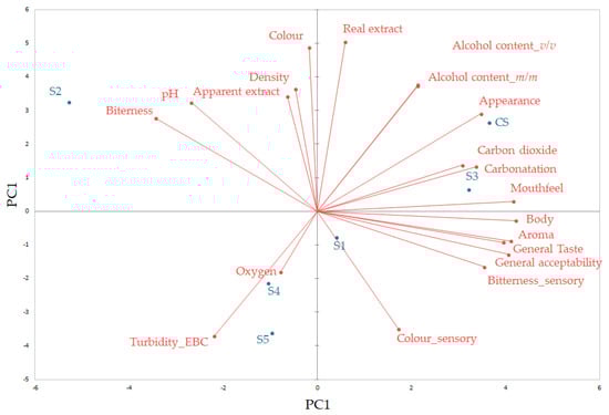 Principal component analysis (PCA) loadings of the physicochemical and sensory characteristics and beer samples are shown in Figure 5. The two axes PC1 and PC2 show 44.84% and 30.22% total variance. The first plot, PC1, shows highly significant correlations (p < 0.05) between physicochemical characteristics of real extract and alcohol content (r = 0.821), between density and apparent extract (r = 0.997), bitterness and pH (r = 0.873), and between physicochemical and sensory characteristics carbon dioxide and carbonation (r = 0.985). During alcohol fermentation, the fermentable sugars were transformed into alcohol and therefore the real extract was well correlated with the beer alcohol content. The beer sensory carbonation gave the panelists a burning sensation on the tongue, determined by the amount of carbon dioxide []. All the sensory characteristics of body, general acceptability, aroma, general taste, bitterness, and color were grouped together on the bottom right of the PCA graph. This may be explainable, since on general acceptability of the beers, the highest impact was on the beer’s taste []. The taste was significant correlated (p < 0.05) with bitterness (r = 0.888), aroma (r = 0.995), body (r = 0.954), mouthfeel (r = 0.925), and general acceptability (r = 0.988). Unexpectedly, PC2 clearly distinguished between the physical and sensory characteristics color and bitterness. This was probably due to the raw materials used in this study. The chemical bitterness value was mostly affected by hop addition, whereas the sensory one was affected by beer composition. The sorghum had a sweet taste, which may have affected the bitterness perception of the panelists. Additionally, the sensory color value evaluation may have affected panelists’ perception of the traditional blonde beer color from barley malt and therefore it may be not be positively correlated with the physical characteristic. Of all the analyzed samples, the CS seemed to be rated closest to the S3 sample, which are situated at the right top of the PCA graph. These data are in agreement with those reported by Schnitzenbaumer et al. [], who also concluded that beer with 40% unmalted sorghum is the closest to beer with 100% barley malt. Both S3 and CS beer samples were closely rated on the physicochemical characteristics of alcohol and carbon dioxide, and sensory ones of carbonation, mouthfeel, and appearance. These characteristics seem to have had the highest impact on beer consumers’ preferences. Mouthfeel is closely related with the sensory characteristics of carbonation, drying, astringency, fullness, wateriness, warming, smoothness, and mouth-coating. Different beer compounds have been reported to affect the mouthfeel of beer, which include the content of ethanol, glycerol, polyphenol, carbon dioxide, and foam structure []. Therefore, the association on the PCA graph between physicochemical characteristics of alcohol and carbon dioxide and the sensory one of mouthfeel was somehow predictable. As may be seen, the beers most preferred by the panelists (CS, S3, S1) are situated along PC2 axes on the right side of the PCA graph. All the sensory characteristics were closely associated by them. Among the physicochemical characteristics, the ones with the highest impact were the alcohol content, real extract, and carbonation values. The real extract is a very important factor in beer sensory characteristics. Its composition influences the beer’s body, carbonation, and flavor. Beer is a drink that is distinguished from other carbonated drinks by the ability to form foam with some persistence. Therefore, the carbonation is a very important sensory characteristic. High carbon dioxide content in the beer gives foam, which is constantly fed from the bottom and dries on the surface, where it becomes stable. The consequence is the increase in the persistence of the foam. It can be promoted by stirring the beer, which facilitates the access of air, forming more fine and stable bubbles in the beer. Therefore, the physicochemical carbon dioxide characteristic had a high impact on panelists’ beer preference. Beers S4 and S5 are also clustered together on the bottom left side on the PCA graph, indicating that the samples with high amounts of unmalted sorghum in their recipe were similar from the physicochemical and sensory points of view. These samples were most associated with turbidity and oxygen values. This association may be due to the fact that these samples contained the lowest amounts of malt in their recipe. S1, which was also well appreciated by the panelists, who rated it as “like very much” according to the mean value of general acceptability, which was closely associated with sensory characteristics of color, bitterness, general taste, aroma, body, and general acceptability. The plot of PC1 vs. PC2 clearly distinguished the S2 sample by all sensory characteristics, in agreement with our sensory data, which indicates that this sample was the least appreciated by the panelists.