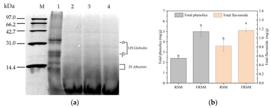 (a) MW distribution presented by SDS-PAGE; M: protein marker; 1: protein sample of unfermented rapeseed meal (RSM); 2, 3, and 4: protein samples of fermented rapeseed meal (FRSM). (b) Total phenolic and total flavonoid content. a, b mean values which do not share a common superscript letter are significantly different (p < 0.05).
