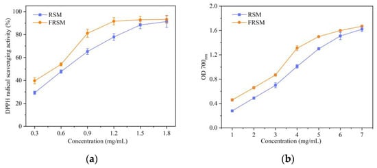 The DPPH radical scavenging activities of the RSM and FRSM is presented in Figure 2a. DPPH radical scavenging activities of RSM and FRSM were different in the concentration of 1.5 mg/mL (p < 0.05) and significantly different in the concentration of 0.3–1.2 mg/mL (p < 0.01). DPPH radical scavenging activity of FRSM was 91.63 ± 3.17%, 81.13 ± 3.52%, 54.08 ± 1.35%, and 39.72 ± 2.56%, respectively, at the concentration of 1.2, 0.9, 0.6, 0.3 mg/mL, while that of the RSM reached 77.90 ± 2.89%, 65.23 ± 4.51%, 47.79 ± 1.47%, and 29.32 ± 1.42%, respectively, at the same concentration. The EC50 of FRSM was 0.72 ± 0.01 mg/mL, while the EC50 of RSM was 0.91 ± 0.07 mg/mL, which indicated that the FRSM displayed a higher DPPH scavenging activity compared to the RSM.