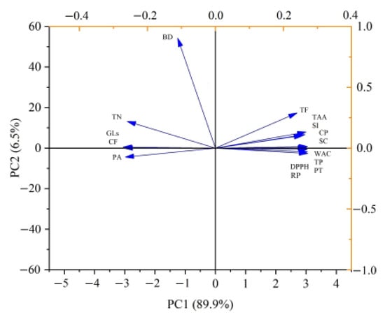 Principal component (PC) analysis was applied to analyze the correlation between the different variables, including nutritional components, anti-nutritional factors, bioactive compounds, antioxidant activity, and functional properties of RSM and FRSM. Variables with positive correlations cluster together, and variables with negative correlations are distributed at either end of the line passing through the origin. The coordinates of each variable correspond to the correlation and directionality with PC1 and PC2, respectively.