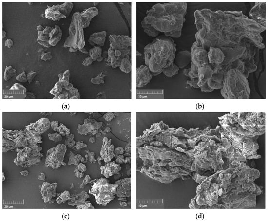 Microstructure of unfermented and fermented rapeseed meal. (a,b): unfermented. Rapeseed meal (RSM); (c,d): fermented rapeseed meal (FRSM); Magnifications of SEM photographs (a,c) and (b,d) are 2000× and 5000×, respectively.