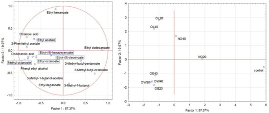 According to the PCA, five factors had eigenvalues higher than 1, cumulatively explaining 96.65% of the total variance of the initial data set. PC1 and PC2 comprised 77.34% of the variability. Ethyl dodecanoate contributed to the positive aspect of PC1, while phenyl ethyl alcohol, methyl octanoate, ethyl-(9)-decenoate, ethyl 9-hexadecenoate and dodecanoic acid mostly contributed to the negative aspect of PC1. A clear separation among the Grašac wine samples can be observed, while it was found that samples treated by the same IYDs, regardless of concentration, were relatively similar and distributed closer to each other in the PCA plot. The samples treated by OE and OW in both concentrations were distributed in the lower negative quadrant. Compared to other samples, the number of volatile compounds that contributes significantly to the aroma of these wine samples was larger. Among them, ethyl decanoate, phenyl ethyl alcohol, 3-methyl-1-butanol-acetate and methyl octanoate were the most significant. Additionally, these samples were negatively correlated with ethyl hexanoate. The OL-treated samples were clearly different from the other wine samples, with ethyl hexanoate as the compound considered the most responsible for aroma. These samples were characterized by the lower loadings of 3-methyl-1-butanol and 3-methyl- butyl -octanoate. On the other hand, the control wine sample separated well from the IYD-treated samples by PC1, and was located in the lower right quadrant (positive values for PC1 and negative for PC2), far apart from the treated wine samples. Ethyl dodecanoate showed a high positive loading score in PC1, which distinguished the control wine sample from the other samples.
