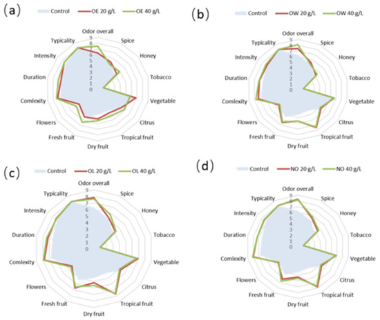 Sensory analysis of smell attributes of Grašac wines produced with the addition of IDYsafter 6 months of aging: (a) Oennolees™ (20 g/L and 40 g/L), (b) Optimum White™ (20 g/L and 40 g/L), (c) Opty Less™ (20 g/L and 40 g/L), (d) Noblesse™ (20 g/L and 40 g/L). The light-shaded area represents the control wine.