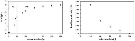 Growth of P. pastoris expressing RBD in flask cultures. (A) Biomass concentration (g DCW/L) evolution during flask cultivation. P1: exponential growth phase in LSM with 10 g/L glycerol, P2: Induction phase with methanol pulses at a final concentration of 1% (v/v), each 24 h incubation. Error bars indicate 2 SD. (B) Variation of the specific growth rate (μ) during the induction phase. During the induction of expression, the culture continued growing with a decrease in the growth rate due to the limitation of methanol.
