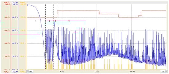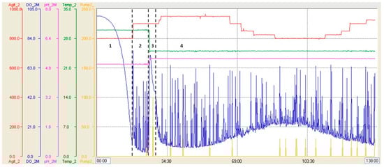 Parameter profile of fermentation carried out in 14 L stirred-tank bioreactor with Strategy 2. Blue line: dissolved oxygen level (saturation percentage), red line: stirring (RPM), yellow line: feeding (pumping percentage). 1: Batch phase, 2: glycerol-fed-batch phase, 3: transition phase, 4: induction phase.