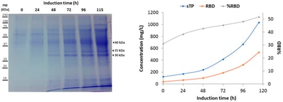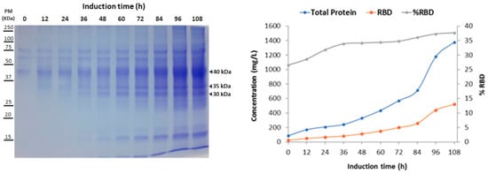 The parameter profile of the fermentation shown in Figure 4 specifically displays the variation of stirring, dissolved oxygen, and feeding during the process. It shows the decrease of the DO level in the batch phase until its abrupt increase (DO spike) and, later, the variations of dissolved oxygen that controlled the feeding of glycerol and methanol. In the DO-stat cultivation strategy, the input of the substrate was regulated by %DO. This means that, during the whole procedure, pulses of glycerol or methanol will be associated with fluctuations in %DO, which do not affect cell growth. The SDS-PAGE analysis revealed the increase in total protein and recombinant RBD during the induction phase with methanol (Figure 5A). It is worth mentioning that the glycosylated variants of the recombinant RBD corresponded to the diffuse bands of around 40, 35, and 30 kDa. Figure 5B shows the increase in total proteins and RBD concentration, as well as the percentage of RBD in total proteins every 24 h of the induction phase. The RBD concentration increased more than 14-fold, and the percentage of RBD in total proteins increased from 31% to 52% at the end of this phase.