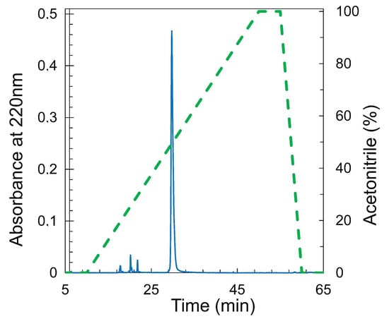 The RBD was recovered from the fermentation supernatant as already described []. Briefly, 1–2 L fractions of the supernatant were purified in a single step using 20 mL of a Ni2+-NTA affinity column. Pure RBD was eluted using imidazole as a competitor, and the protein was dialyzed with Tris 20 mM and NaCl 150 mM, pH 7.4. The protein analysis resulted in being identical to the one already characterized for the production at a smaller-scale fermentation, as the UV spectrum, mass spectrum, SDS-PAGE, and circular dichroism were indistinguishable from those previously reported by our group [,]. The protein batches of 7 L reported here were also obtained at more than 95% purity as determined by the HPLC analysis (Figure 6).