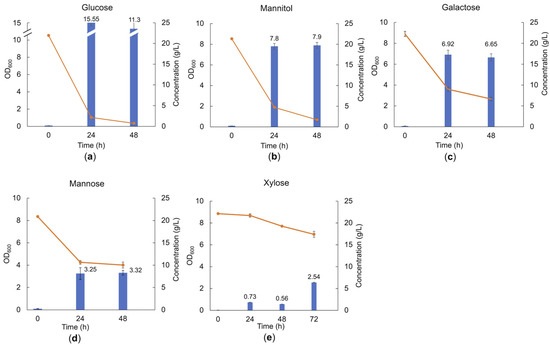 Cell density and carbohydrate consumption of the LAB consortium in the presence of glucose (a), mannitol (b), galactose (c), mannose (d), and xylose (e) after 48 h or 72 h batch cultivation in MRS medium supplemented with 20 g/L of the respective substrates. Blue bars represent the optical density at 600 nm (OD600); orange line represents sugar concentration in the medium; and error bars show the standard deviation between duplicate measurements.