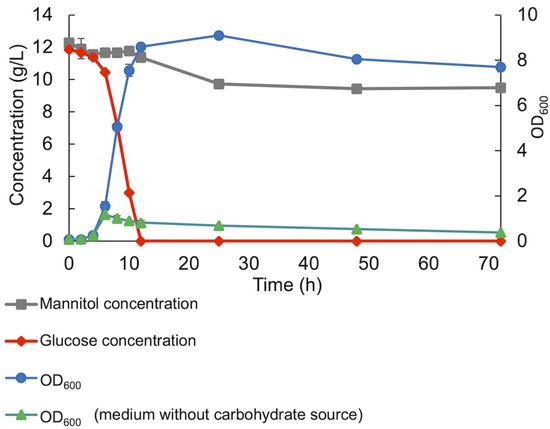 In co-cultivations, with both glucose and mannitol in the medium, the consortium preferably utilized glucose, showing glucose catabolite repression, reaching an OD600 of 8.4 ± 0.03 with an initial glucose concentration of 12 g/L (Figure 4). Only a small amount of mannitol (0.9 g/L) was used before reaching the stationary phase, and in total, 2.7 g/L of mannitol was consumed over 72 h of cultivation. The specific growth rates in the presence of individual substrates (glucose and mannitol) were calculated as 0.66 h−1 in the presence of glucose and 0.56 h−1 in the presence of mannitol. However, the specific growth rate throughout the co-fermentation of glucose and mannitol was obtained at 0.65 h−1, similar to the specific growth rate in the presence of only glucose.