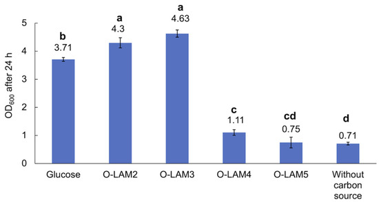 Growth of the LAB consortium in the presence of glucose and laminari-oligosaccharides O-LAM2-5. O-LAM2, O-LAM3, O-LAM4, and O-LAM5 represent laminaribiose, laminaritriose, laminaritetraose, and laminaripentaose, respectively. Standard deviation between duplicates is shown as error bars. Significant (p < 0.05) differences are indicated by letters (a–d).