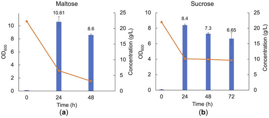 Cell density and carbohydrate consumption of the LAB consortium in the presence of maltose (a) and sucrose (b) after 24 h, 48 h, and 72 h batch cultivation in MRS broth base supplemented with 20 g/L of the respective carbohydrate substrate. Error bars represent the standard deviation of duplicates.