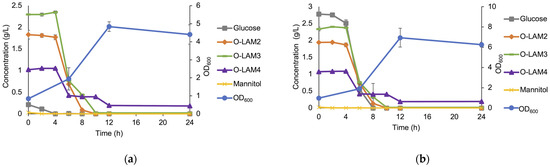 The growth of the LAB consortium in the medium supplemented with laminarin hydrolysate (5 g/L) (a) and hydrolysate (5 g/L) with additionally added glucose to a final concentration of 2.5 g/L (b). Error bars represent the standard deviation of duplicates.